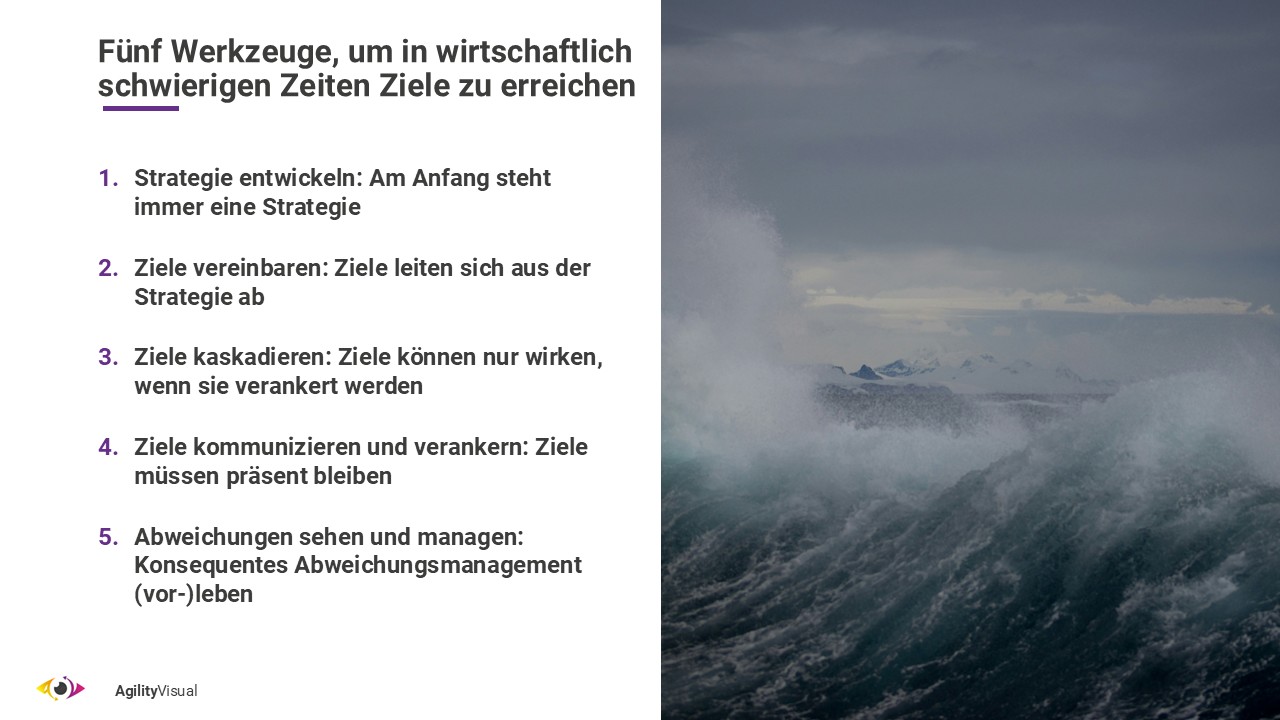 - 2. Ziele vereinbaren: Ziele leiten sich aus der Strategie ab und geben vor, was im aktuellen Geschäftsjahr zu erreichen ist
