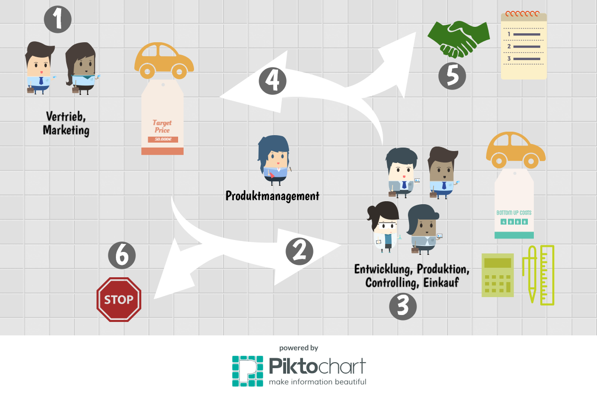Das Produktmanagement (in Zusammenarbeit mit dem Controlling) hat nun die Aufgabe, aus dem Zielpreis und den Vorgaben des Vertriebs- und des Marketings Zielkosten abzuleiten. Eine weitere Eingangsgröße für diesen Prozess bilden strategische Unternehmensvorgaben zu Renditeerwartungen und Wachstumszielen.