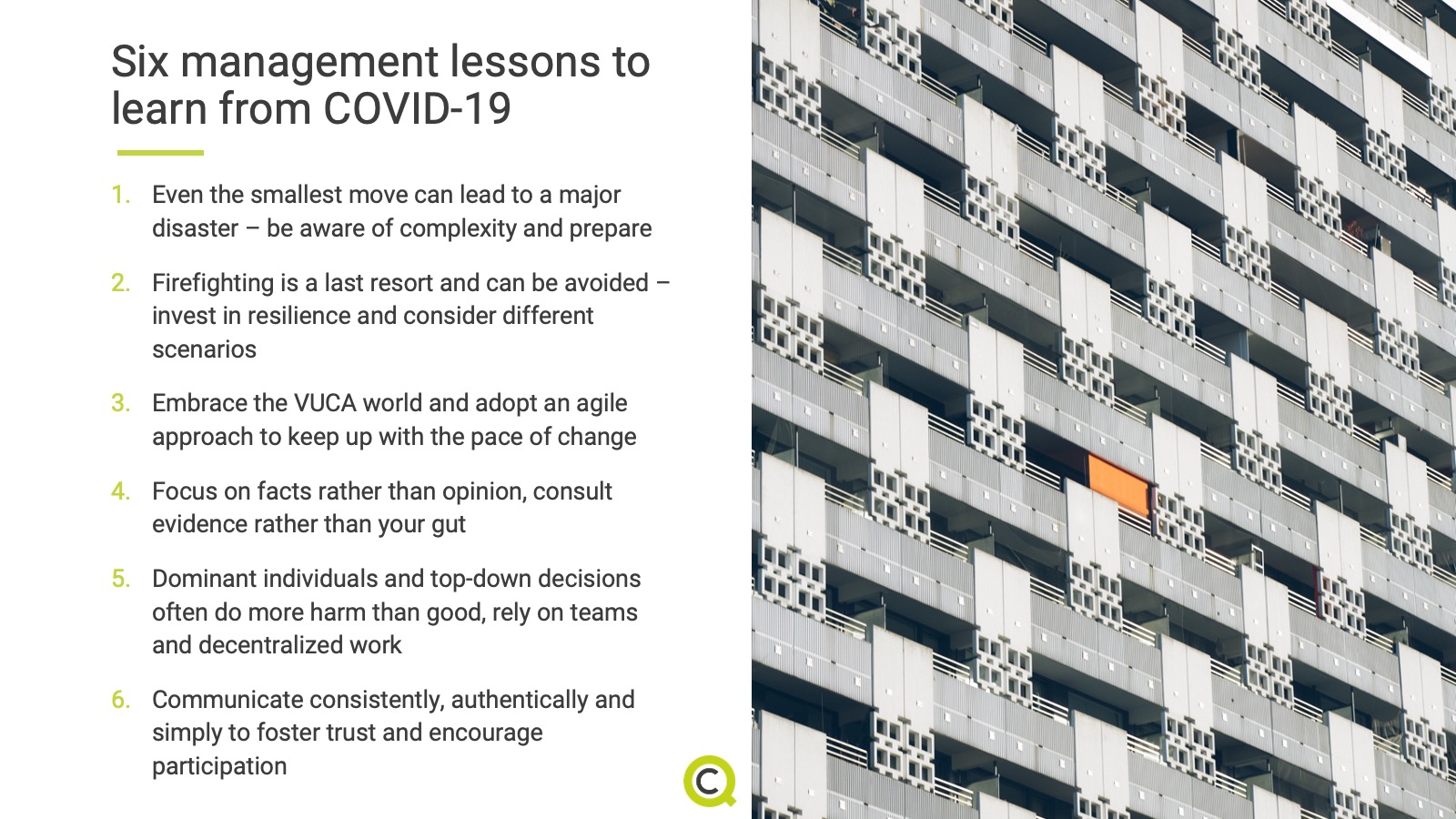 The three challenges in the fields of change, complexity and leadership provide a rough framework along which we can think when asking what the crisis has taught us until now and what we can learn from it.