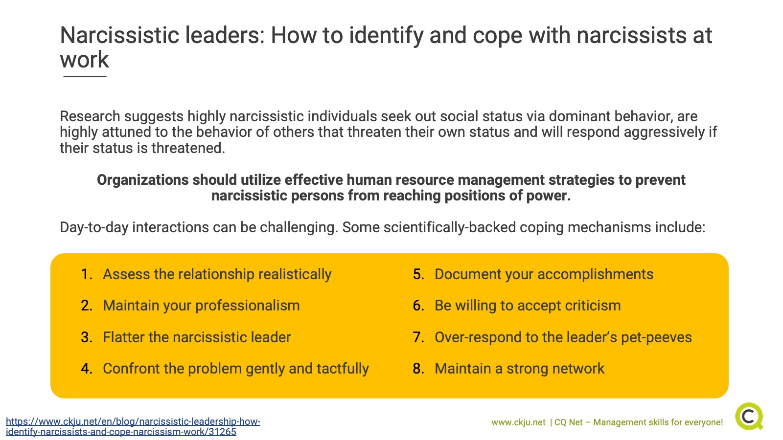 Narcissistic leadership: How to identify narcissists and cope with narcissism at work