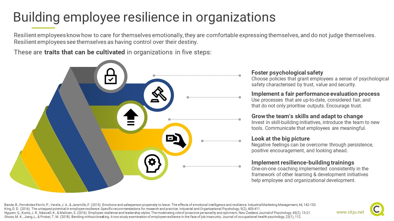 - Third, Vanhove et al (2015) come to the conclusion that the effect of resilience-building trainings seem to fade out over time. As a consequence, resilience-building training should not be implemented as a onetime intervention, but as part of a broader learning and development program to develop your organization to the next level.