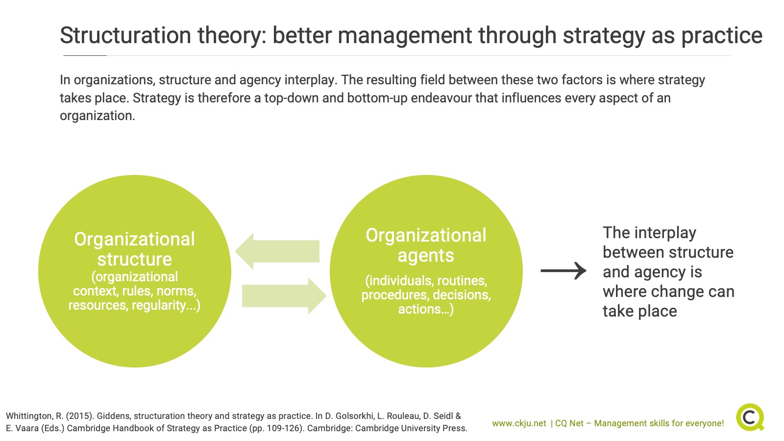 From a practical perspective, structuration theory and its application in the "Strategy as Practice" approach encourages us to always look behind routines, behaviors, and rituals to determine their structural foundation. Of course, we can also ask the questions the other way round: How do practices reproduce structures? Effective change interventions have to take both structure and practice into consideration.