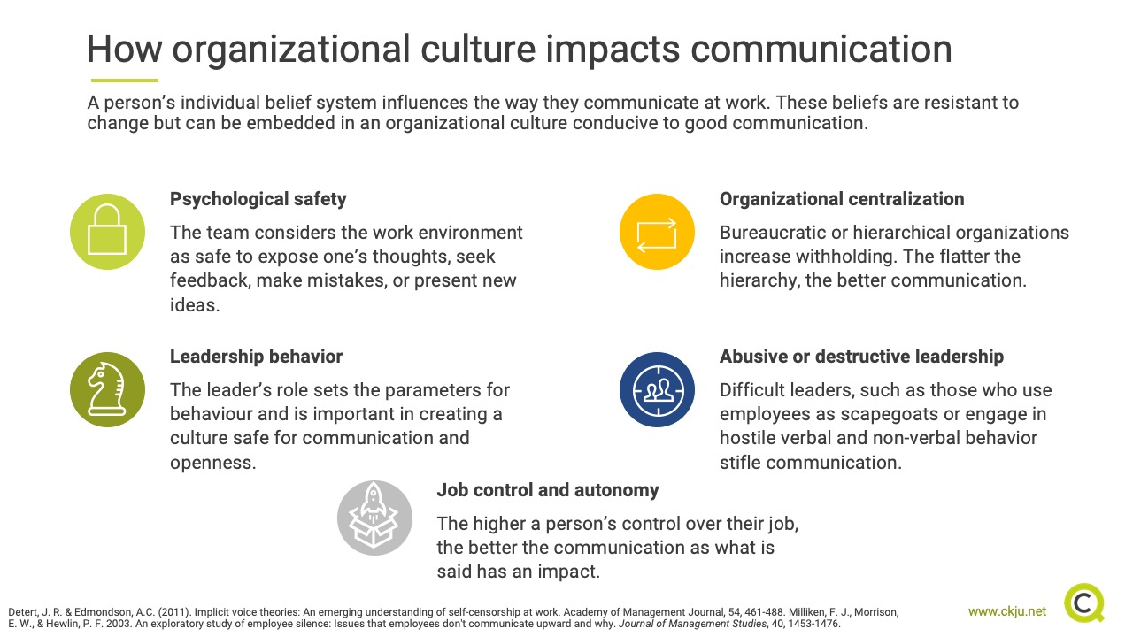 Milliken, Morrison, and Hewlin (2003) proposed that part of the acclimation process to a workplace includes learning what is okay to discuss and what one should be quiet about. Essentially, they argued that people should learn the organization’s culture and adjust their communication style to match it. There are numerous cultural variables that affect communication, so only the most significant ones will be discussed in this CQ Dossier.