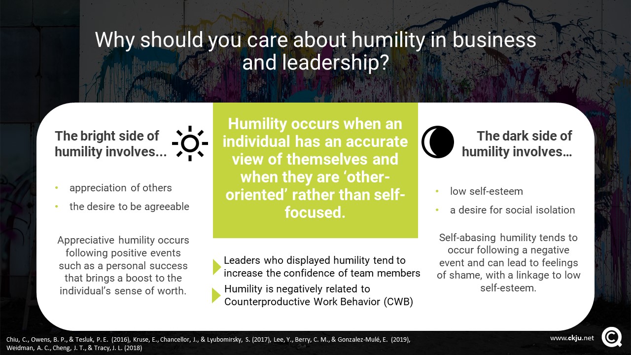 Weidman and colleagues challenge the notion that humility is a positive force in the workplace and suggest that it might have a ‘dark’ side. In a series of studies, they found that individuals conceive humility as both a positive and negative construct. These distinct dimensions of humility represent an appreciative component and a self-abasing component (Weidman et al., 2018).
