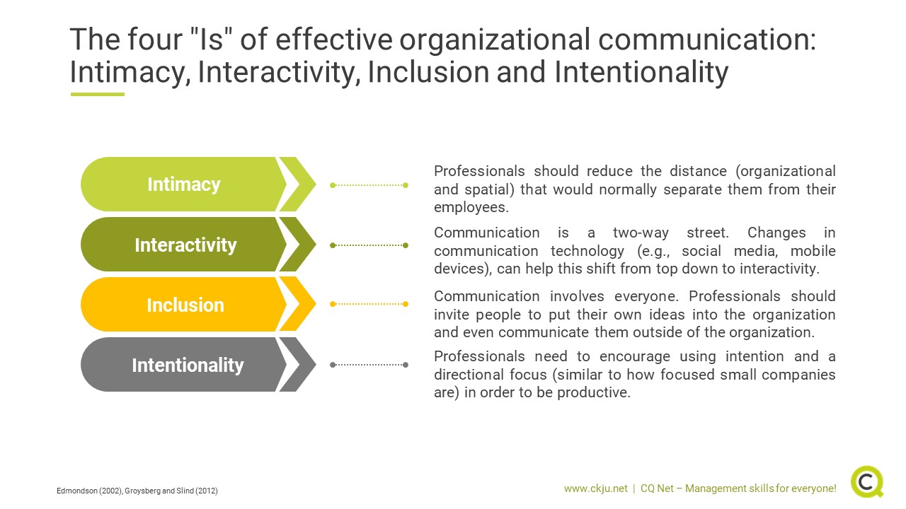 Groysberg and Slind (2012) took their findings successful companies and developed the “Four Is of organizational communication”: