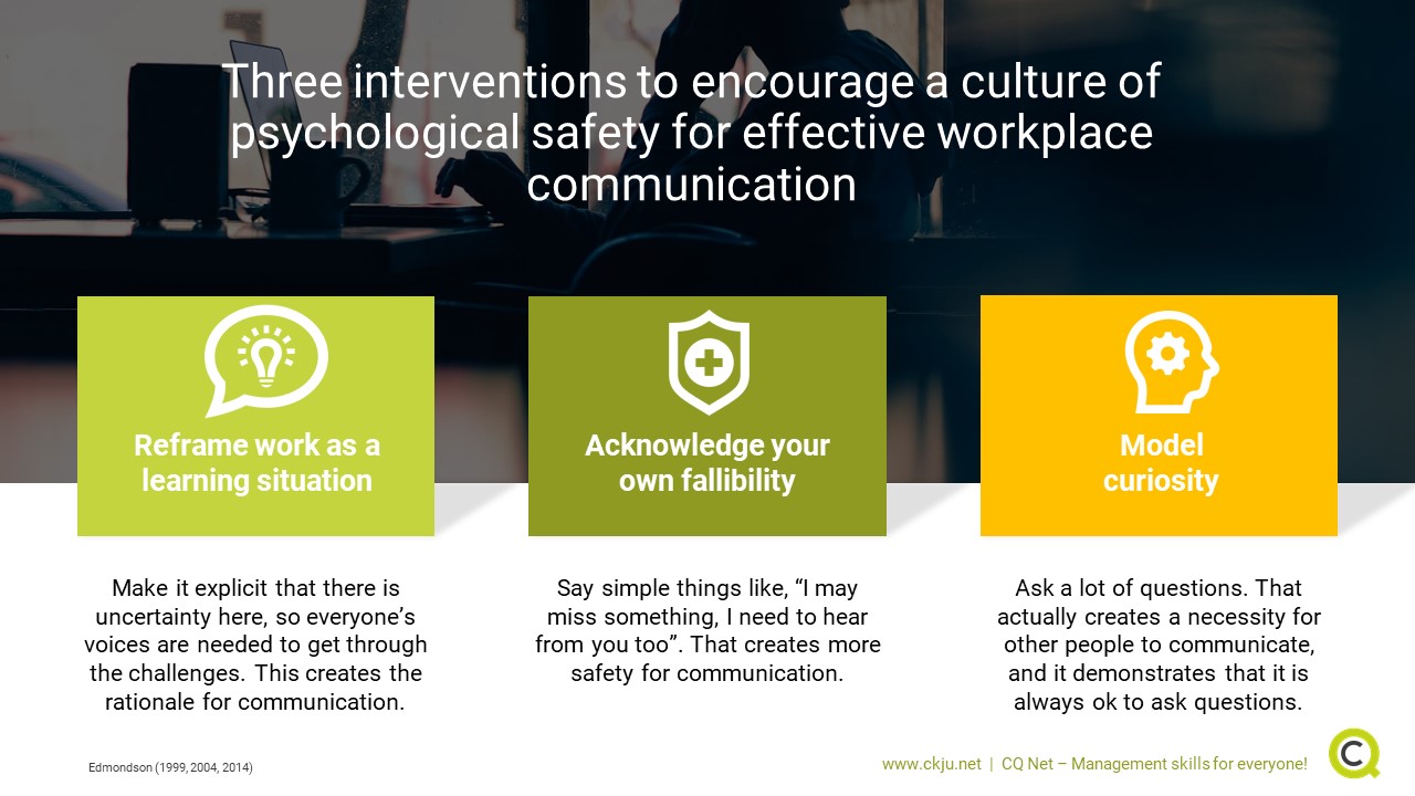 In our CQ Dossier on how organizational culture impacts communication, the research documenting the significant link between psychological safety and communication was discussed (e.g, Edmondson, 2004; Edmondson, 1999).
