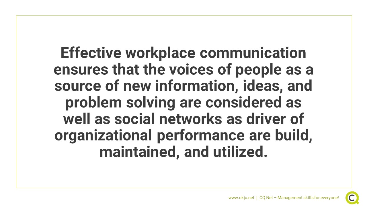 Rather, professionals must harness the voices of people within the company as a source of new information, ideas, and problem solving. Furthermore, effective workplace communications ensure that social networks within an organization are build, maintained, and utilized. When effective, those social networks are in important driver of organizational resilience, complexity management, innovation and many more outcomes related to organizational performance.