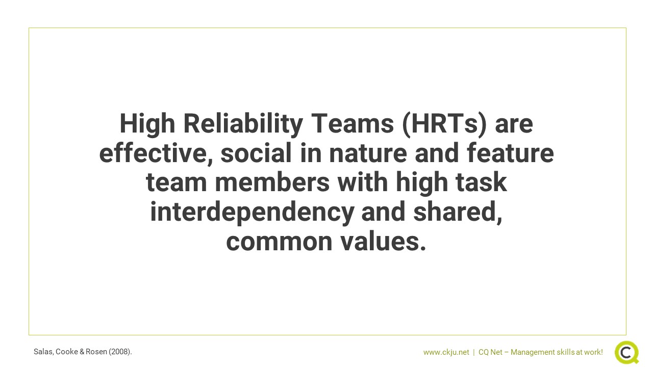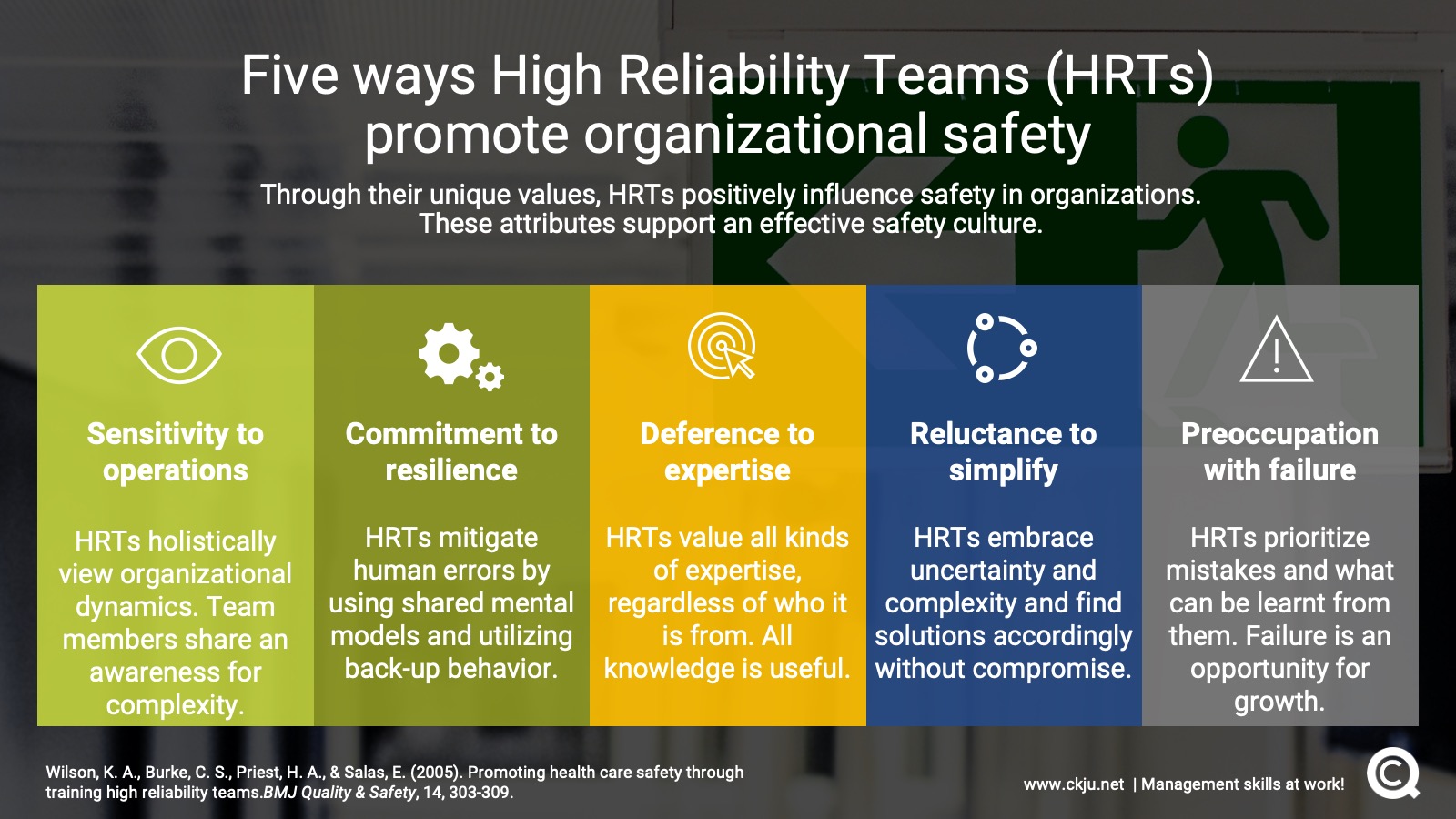 Decades of team-based research has demonstrated that teams are more effective than the sum of individual effort (Salas, Reyes & McDaniel, 2018). HROs have long recognized that teams - and concretely HRTs - can take on more involved work than individuals and can combine their abilities to provide backup behavior, thereby mitigating human error within the organization. This particular characteristic of HRTs ensures that team members can monitor each other to reduce errors and thereby increase safety in the work environment.