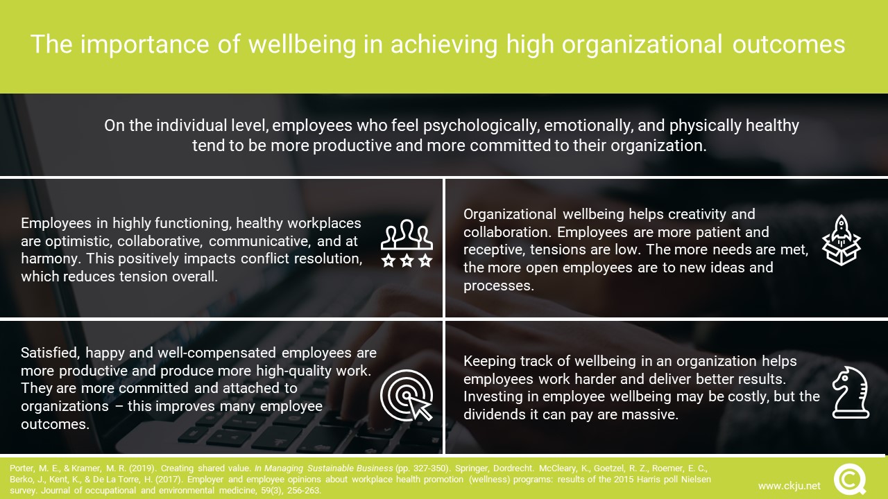 One sizeable benefit of promoting organizational wellbeing is an improvement in how conflicts are resolved (Goh et al, 2015). Some degree of disagreement and struggle is necessary within an organization; new ideas and accurate criticisms can be emotionally challenging, but can provide massive benefits. However, workplace conflict must be relatively low-intensity, and must be responsibly managed, in order to bear organizational fruit.