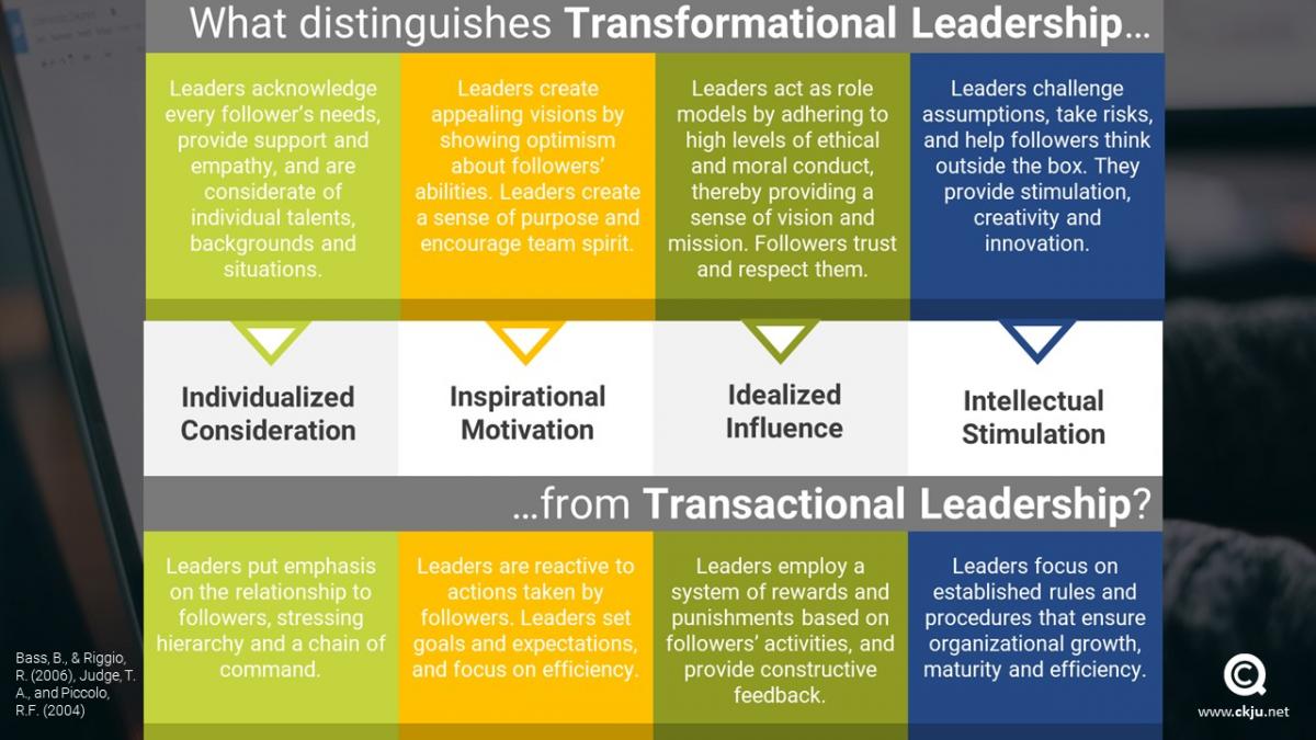 For instance, transformational leadership has been connected to successful change projects and is defined by the four main behaviors idealized influence, individualized consideration, inspirational motivation and intellectual stimulation (e.g. Chou 2014). The assumption behind transformational leadership is that these four behaviors make a visionary leader who develops his followers to a higher performance level. Transformational leadership is usually contrasted to transactional leadership which is mostly about managing deviations and exceptions. However, there are most properly times when managing deviations is exactly what you need. Thus, you should be familiar with both leadership approaches.