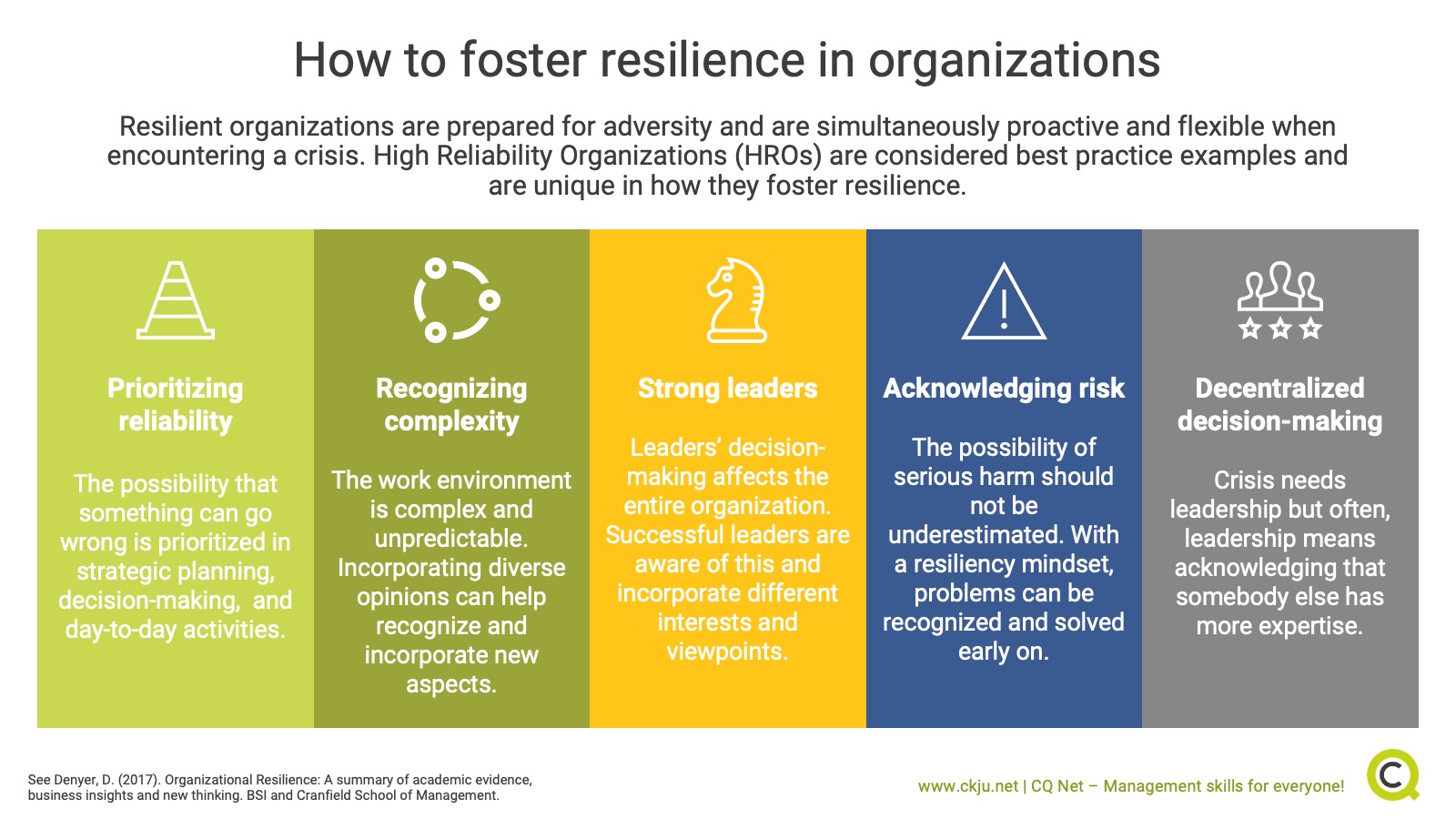 The organizations that do well during a crisis and show resilience take precautionary measures so that they are not overwhelmed when a crisis occurs. These precautionary actions can include employee training for dealing with emergencies or the formulation of a continuity plan in case there is a collapse in the economy.