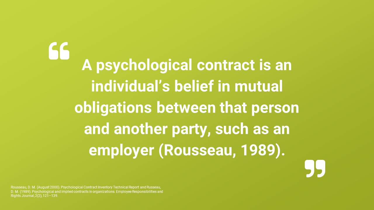A psychological contracts is an individual's belief in mutual obligations between that person and another party, such as an employer (Rousseau, 1989).