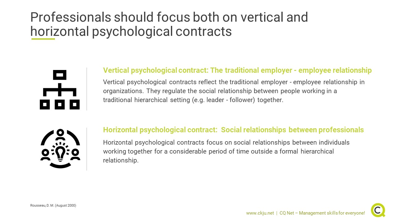 Horizontal psychological contracts focus on social relationships between individuals working together for a considerable period of time outside a formal hierarchical relationship.