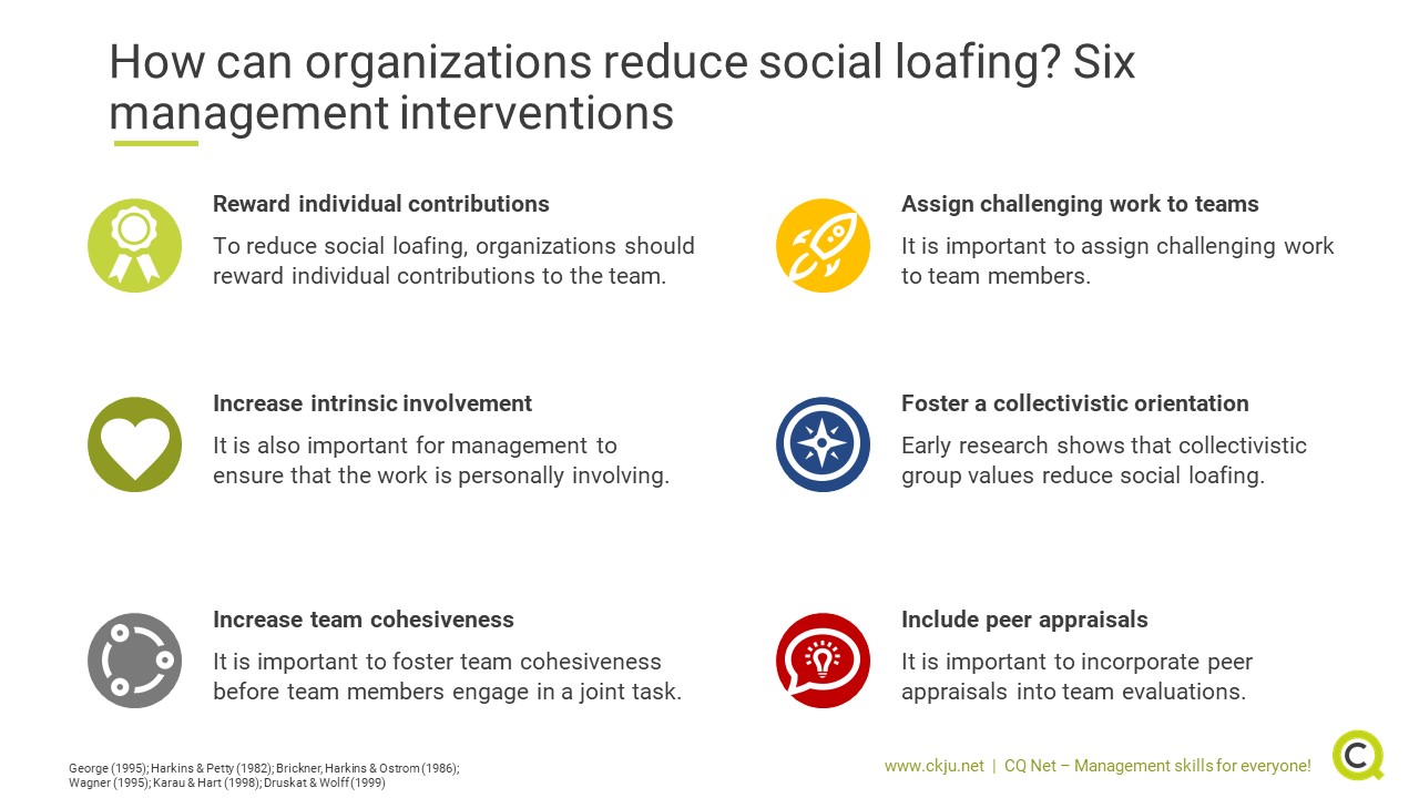 Despite the negative impact of social loafing on team performance, there is a large body of research showing ways in which it can be reduced. Most of these recommendations can be turned into organizational interventions so that teams can be fully productive.