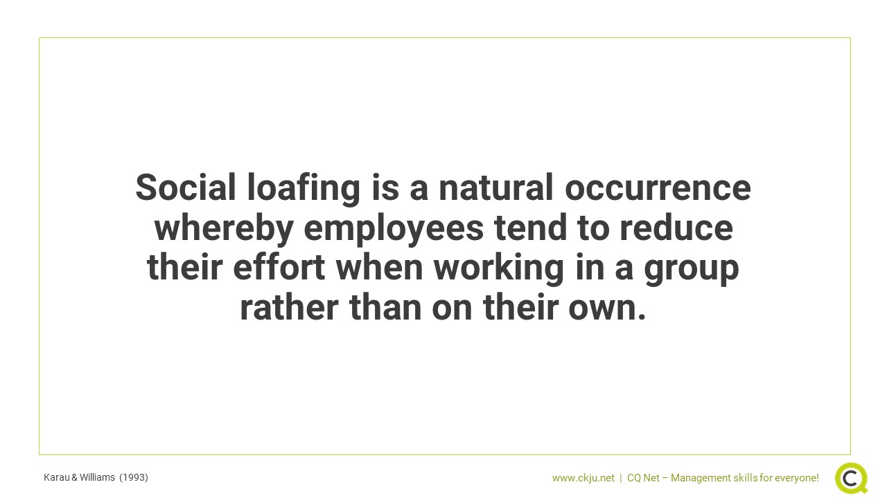 Social loafing is a natural occurrence whereby employees tend to reduce their effort when working in a group rather than on their own (Karau & Williams, 1993). Social loafing is a pervasive phenomenon that reduces employee engagement and organizational effectiveness.