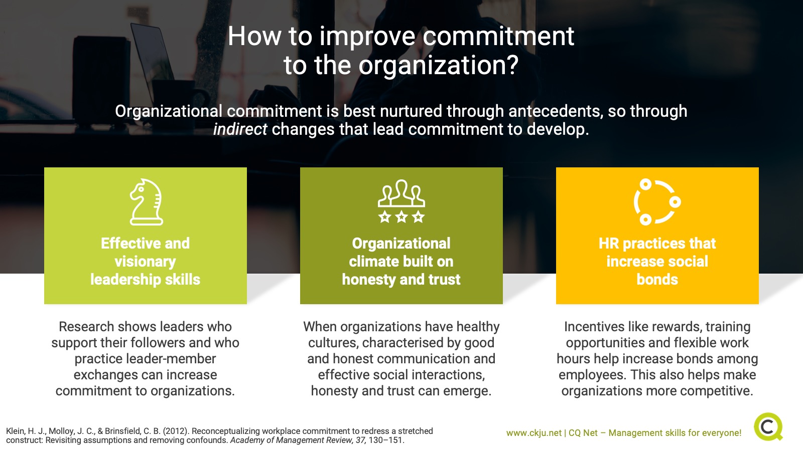 First, organizations can increase commitment through ensuring that employees in managerial positions are equipped with effective leadership skills to influence their subordinates. These skills should include knowledge and practice in leader-member exchanges and how to show support to subordinates (Klein et al., 2012).
